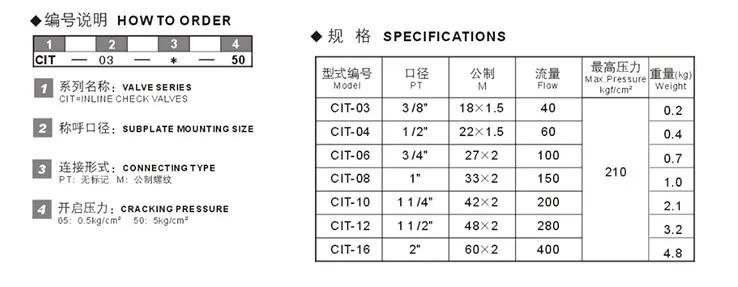 CIT-02 CIT-03 CIT-04 CIT-06 CIT-08 CIT-10 12 Hydraulic straight check valve CIT-03-50-30T CIT-06-35-30T CIT-10-05 check valve